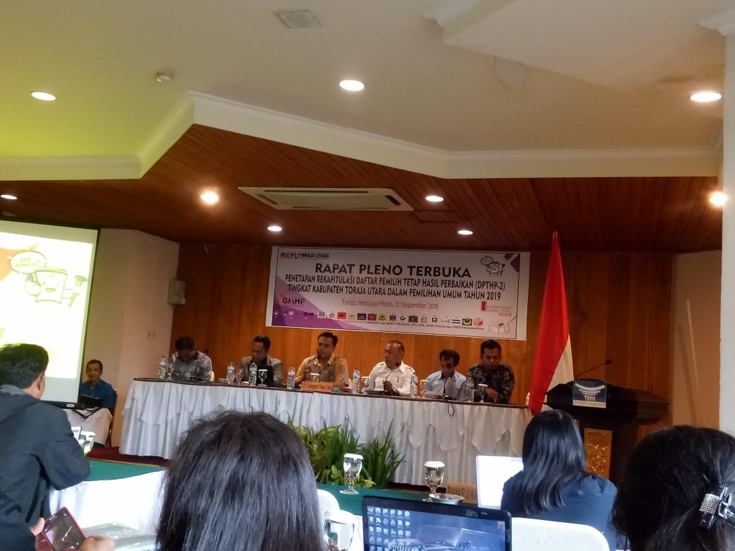 TRIBUNTORAJA.COM, RANTEPAO - Komisi Pemilihan Umum (KPU) Toraja Utara telah menyelesaikan Rapat Pleno Terbuka Rekapitulasi Daftar Pemilih Tetap Hasil Perbaikan (DPTHP-2) di Hotel Heritage, Kecamatan Kesu, Selasa (13/11/2018) malam.