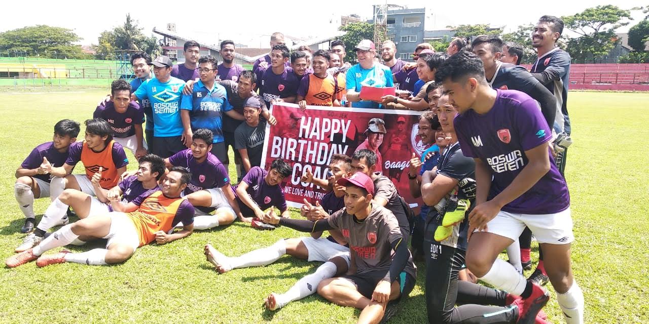 TRIBUN-TIMUR.COM MAKASSAR -- Para pemain, ofisial dan asisten pelatih memberi ucapan selamat kepada Pelatih Robert Rene Alberts yang berulang tahun yang ke-64.