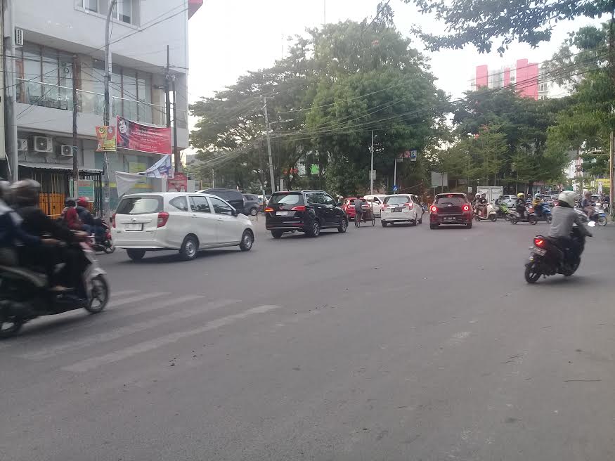 Kendaraan yang melaju dari arah bundaran Jl Veteran menuju Jl Ratulangi terlihat melaju seenaknya.
