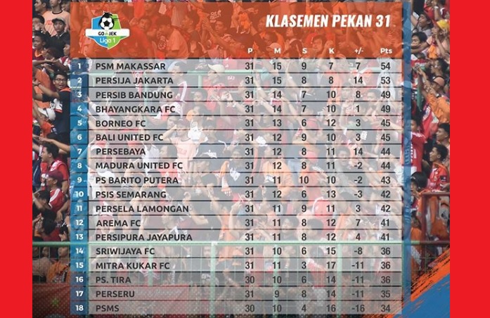 Persija Jakarta cuma terpisah satu poin dengan PSM Makassar. Sementara Persib Bandung terpisah 5 poin dengan 3 laga sisa.