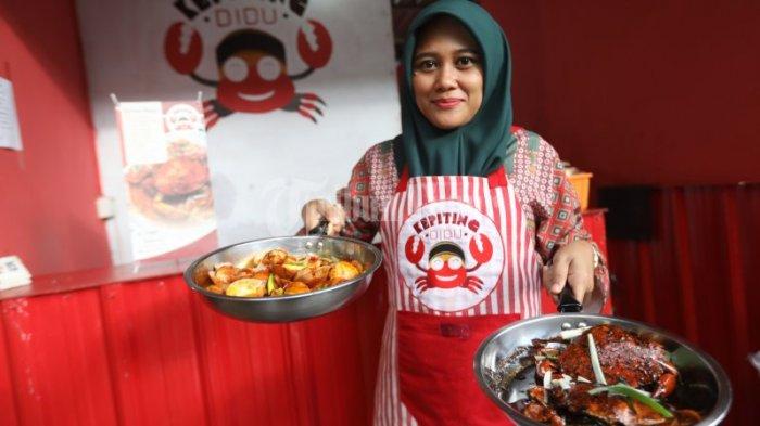 Owner Kepiting Didu, Asriani Thahir memperlihatkan dua menu favorit di Outlet Kepiting Didu, The Project Corner, Jl Pengayoman, Makassar, Sabtu (1/12/2018) siang.