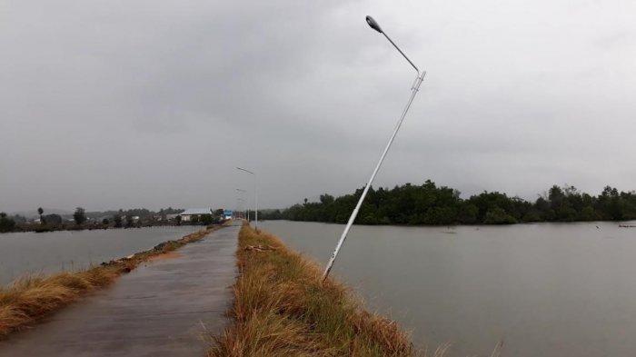 Akibat angin tersebut, dua tiang lampu jalan di Pusat Pelelangan Ikan (PPI) Balambang miring.