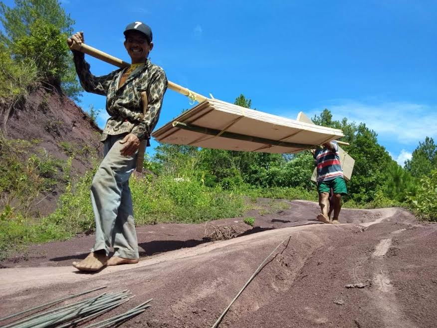 Akibat jalan yang tidak bisa dilalui kendaraan roda empat dan berlumpur, warga setempat dan imam masjid pikul bahan bangunan sejauh 6 kilometer.