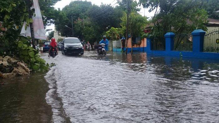 Genangan setinggi lutut orang dewasa menutupi ruas jalan beton dan memasuki rumah-rumah warga.