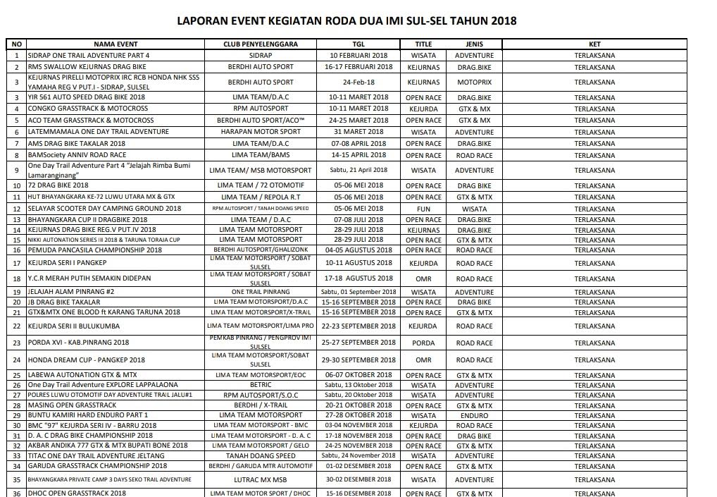 "Diantaranya Adventure, Kejurnas (Drag Bike), Kejurnas (Motoprix), Open Race (Drag Bike) Kejurda (GTX MX) hingga Porda di Pinrang," papar Sekertaris IMI Sulsel, Taqwa Gaffar, Jumat (1/2/2019).