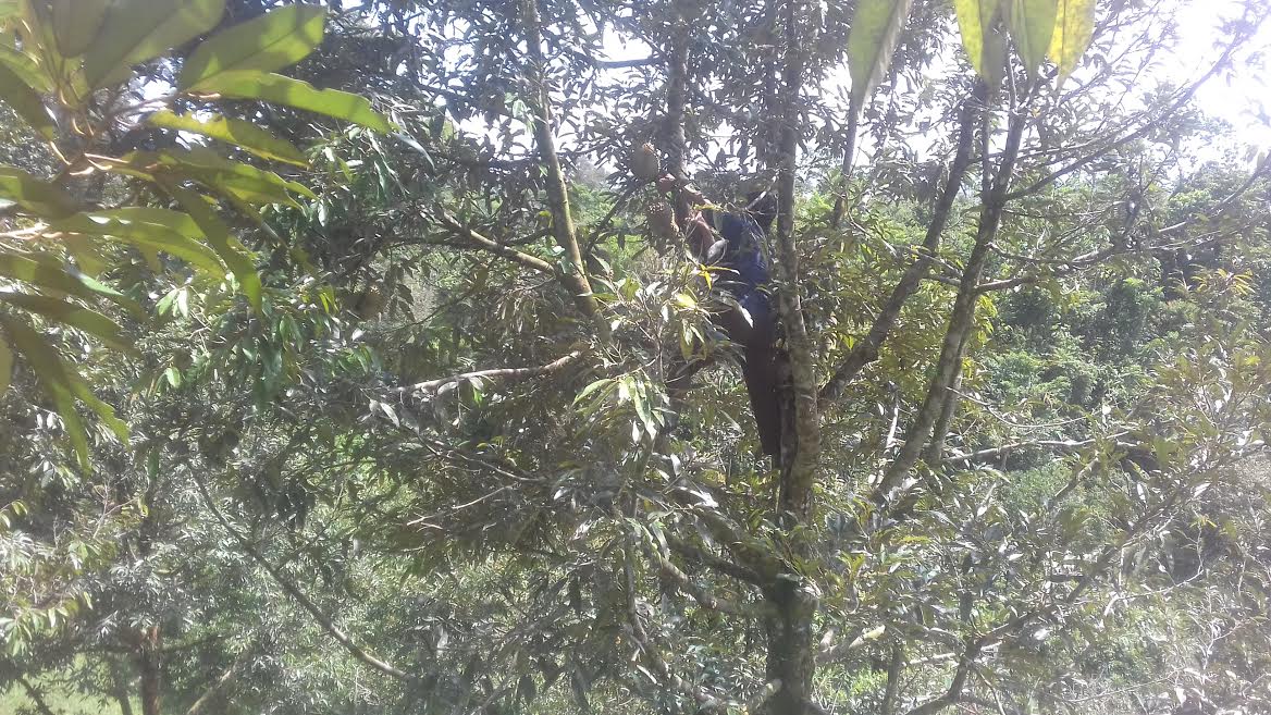 Paulus Palino memanjat pohon Durian otong dan memanen buahnya.