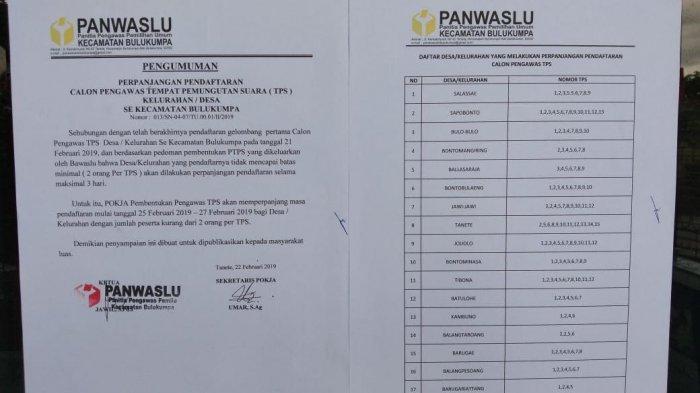 TRIBUNBULUKUMBA.COM, UJUNG BULU - Panitia Pengawas Pemilihan Umum (Panwaslu) Kecamatan Bulukumpa, Kabupaten Bulukumba, Sulawesi Selatan (Sulsel), memperpanjang masa pendaftaran Calon Pengawas Tempat Pemungutan Suara (PTPS) untuk beberapa TPS di Kecamatan Bulukumpa.