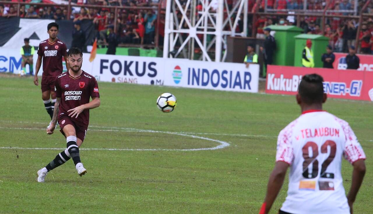 Ia berhasil melesatkan sepakan keras hasil umpan M Rahmat.
