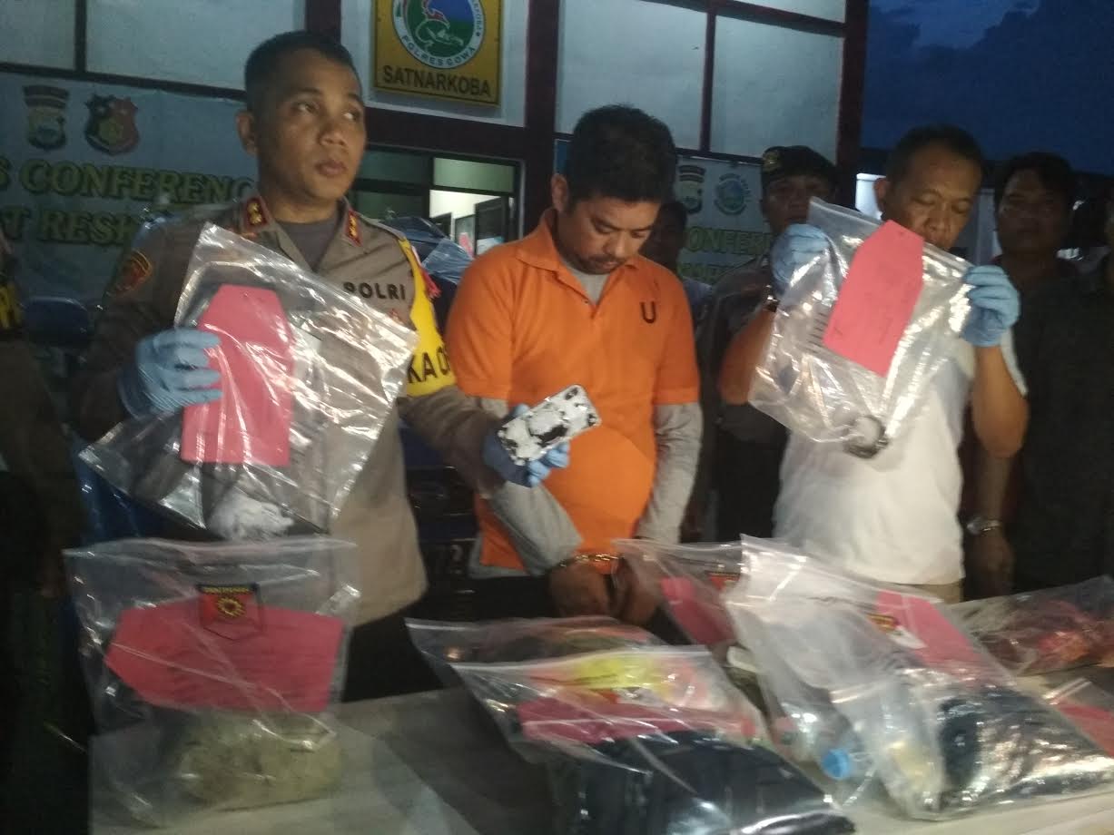 Wahyu Jayadi memakai baju oranye bertuliskan Tahanan Polres Gowa dalam jumpa pers tersebut. Kedua lengannya diborgol petugas.