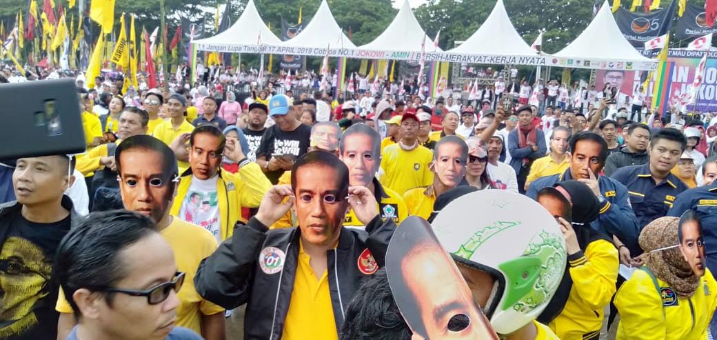 TRIBUN-TIMUR.COM, MAKASSAR -- Massa Partai Golkar Kota Makassar kompak pakai topeng calon Presiden nomor urut 01, Joko Widodo saat menghadiri kampanye terbuka di Lapangan Karebosi, Jl Jend Ahmad Yani, Kecamatan Ujung Pandang, Makassar, Sulsel, Minggu (31/3/2019).