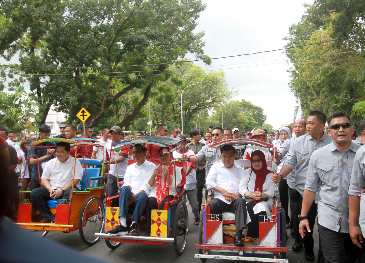 Selain ditemani istri tercinta, Jokowi juga ditemani naik becak oleh Ketua Tim Kampanye Nasional (TKN) Erick Thohir, dan juga Wakil Presiden Jusuf Kalla (JK).