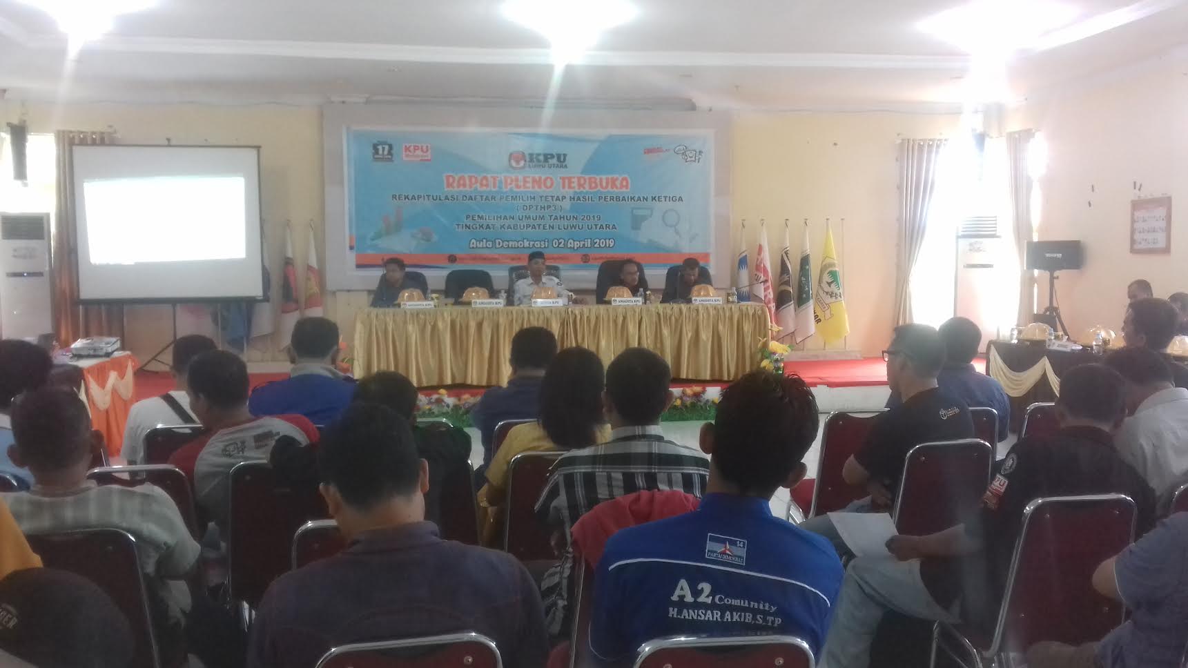 TRIBUNLUTRA.COM, MASAMBA - Komisi Pemilihan Umum (KPU) Kabupaten Luwu Utara menggelar rapat pleno terbuka rekapitulasi dan penetapan Daftar Pemilih Tetap Hasil Perbaikan Ketiga (DPTHP3), Selasa (2/4/2019).