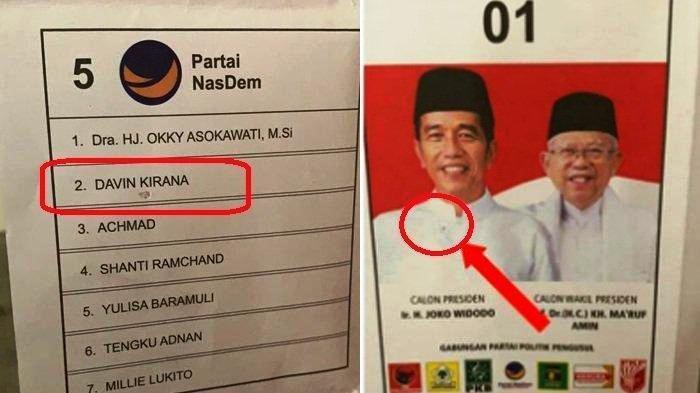 Dalam kertas suara di potongan video tersebut, diduga tertulis nama calon anggota legislatif DPR RI Davin Kirana dan Pasangan Capres 01 Jokowi-Maruf.
