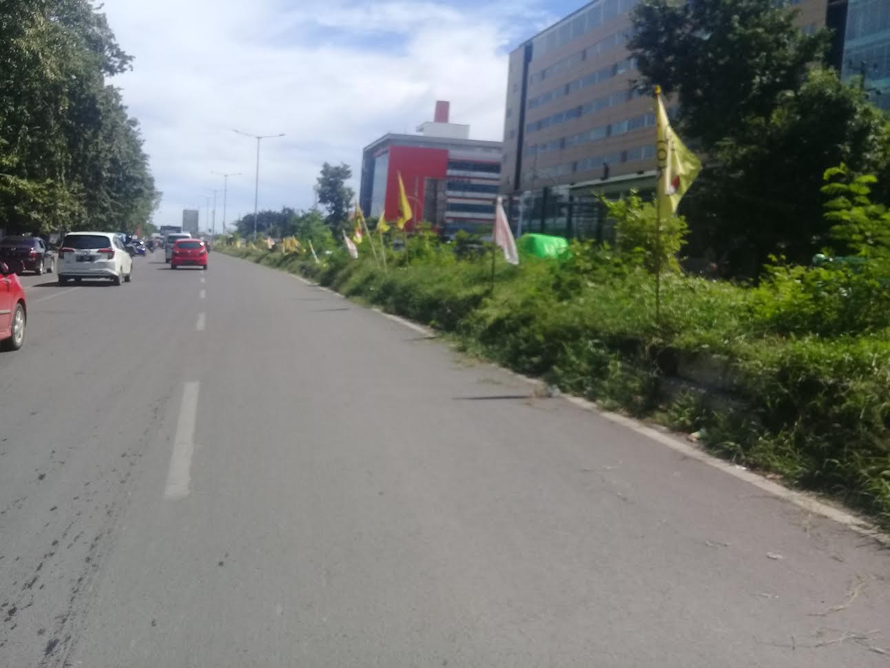 Bendera partai Golongan Karya (Golkar) masih terlihat berkibar di sepanjang trotoar pembatas jalan.