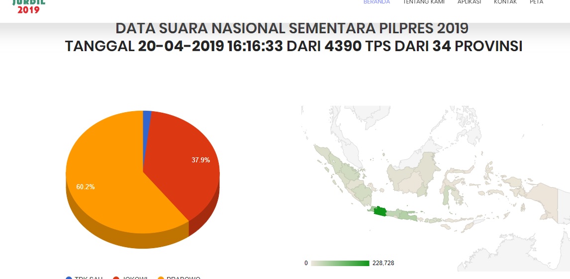 jurdil2019.org-Real Count 4378 TPS, Prabowo-Sandiaga Masih Unggul 60,2%, Jokowi-Maruf Hanya 37,9%
