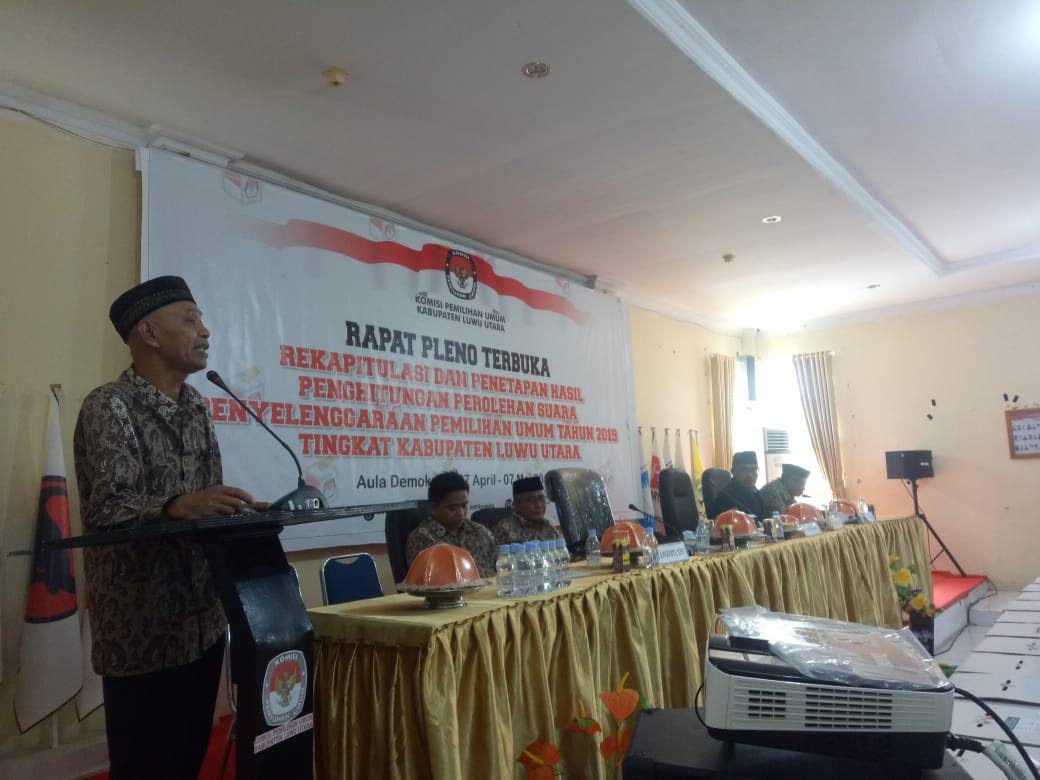 TRIBUNLUTRA.COM, MASAMBA - Komisi Pemilihan Umum (KPU) Kabupaten Luwu Utara menggelar rapat pleno terbuka rekapitulasi dan penetapan hasil penghitungan perolehan suara penyelenggaraan Pemilu 2019.
