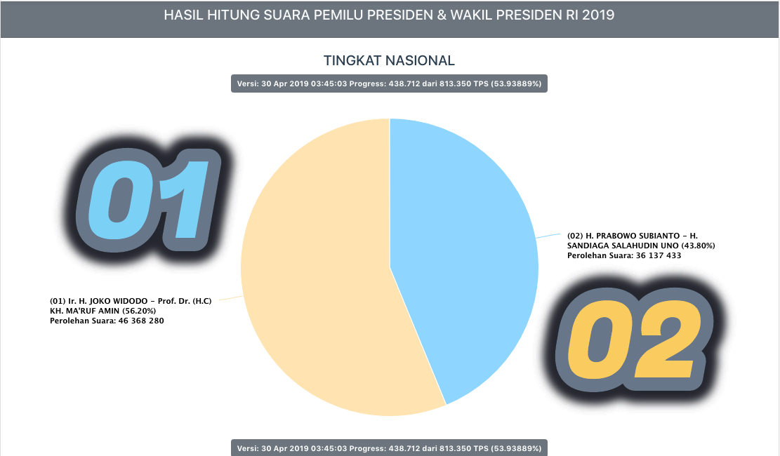Pasangan Jokowi - Maruf Amin unggul dengan perolehan suara 56,20 persen atau 46.368.280, sedangkan Capres dan Cawapres RI nomor urut 02, Prabowo Subianto - Sandiaga Uno memeroleh suara 43,80 persen atau 36.137.433.