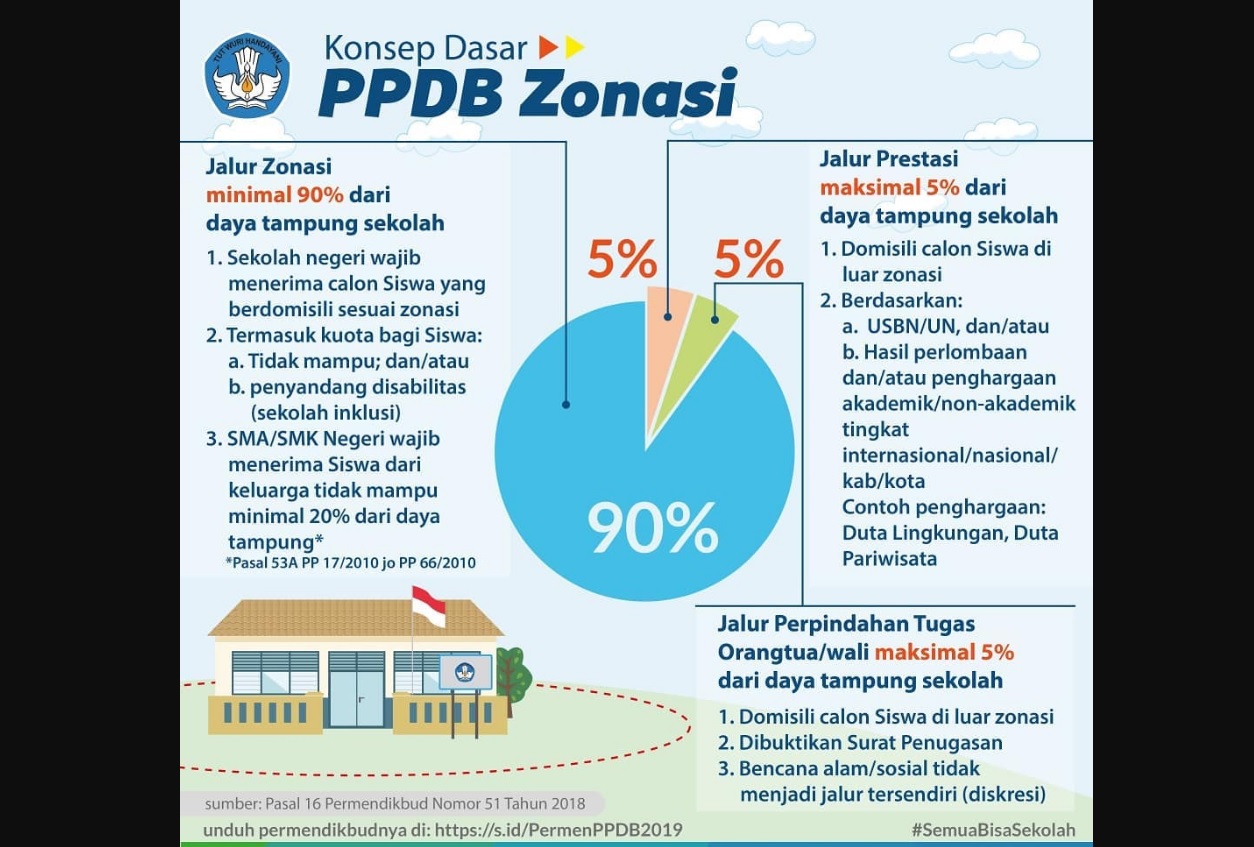 Berdasar dengan Peraturan Mendikbud nomor 51 tahun 2018, dari 100 persen kuota sekolah, memakai sistem zonasi, jalur prestasi, dan pindahan.