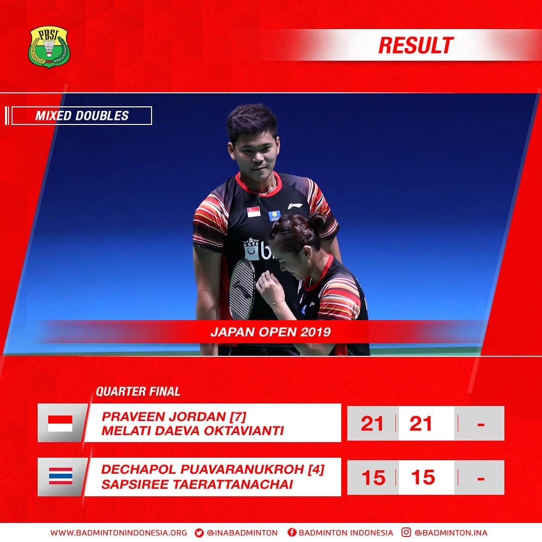 Denga kemenangan tersebut, Praveen/Melati menjadi wakil Indonesia pertama yang lolos ke babak semifinal Japan Open 2019.