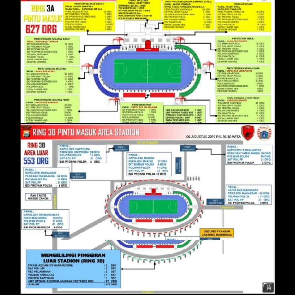 Sedangkan untuk PAM ring 3B mengelilingi pinggiran luar stadion diamankan 477 personel, dari 2 SSK TNI AD Kodam XIV Hasanuddin, 2 SST Sat Pol Air, 2 SST Res Pelabuhan, 1 SST Polsek Tamalate, 1 SST Polsek Rappocini dan 97 personel Unit Opsnal Reskrim Jajaran Restabes Makassar.