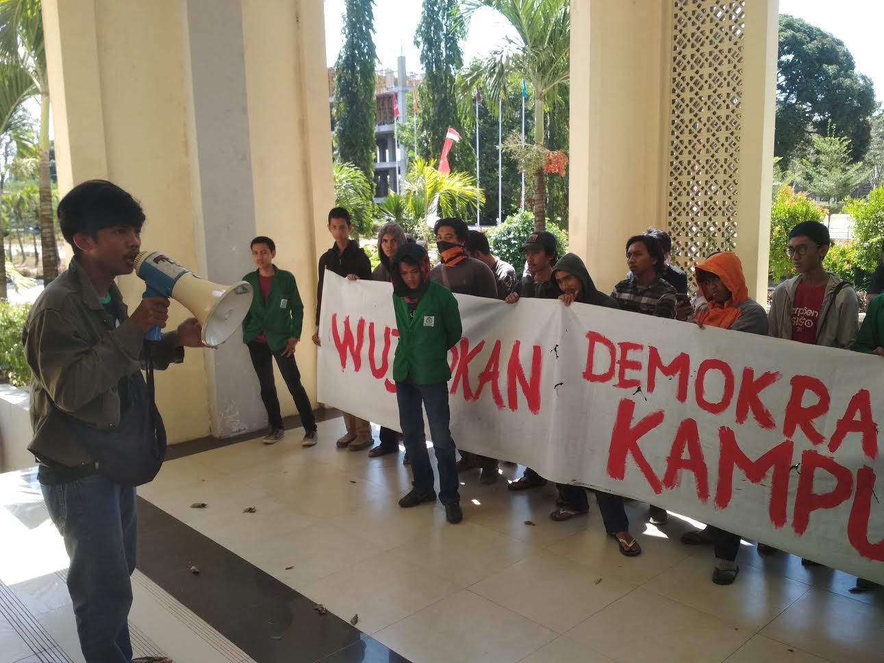 Para mahasiswa juga membawa spanduk aspirasi bertuliskan "Wujudkan Demokrasi Kampus". Mereka menolak pelantikan terhadap sejumlah Dekan.