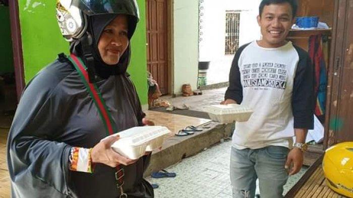 Dengan menggunakan sepeda motor Andi Fatma bersama para anggota IWAPI Enrekang berbagi nasi kotak langsung kepada sasarannya.