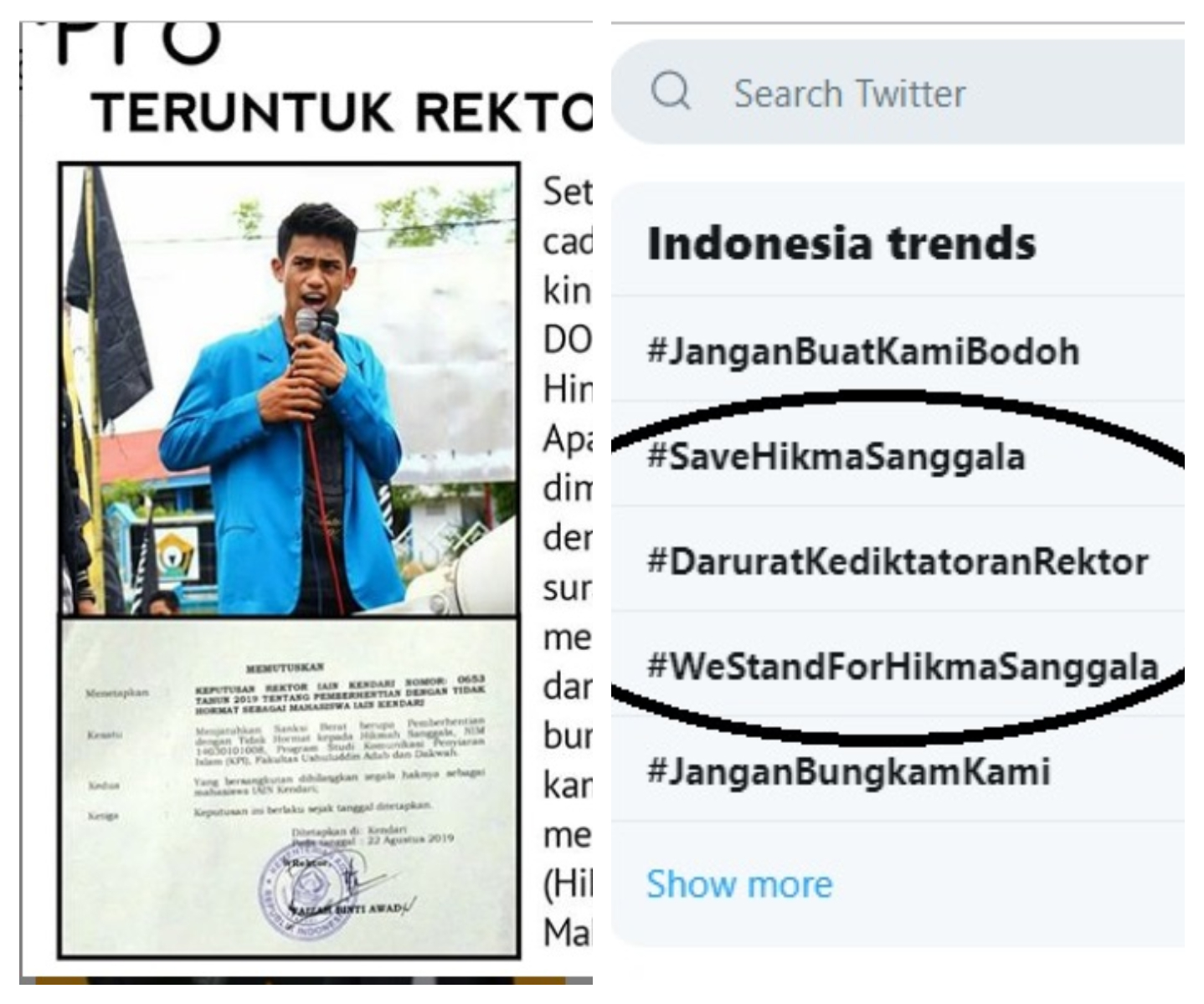 Ada tiga tagar yang dibuat. #DaruratKediktatoranRektor. #WeStandForHikmaSanggala . #SaveHikmaSanggala