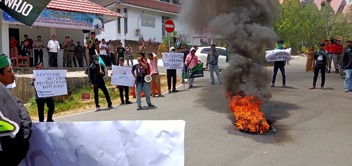 Kali ini, mahasiswa yang tergabung dalam Himpunan Mahasiswa Islam (HMI) Cabang Wajo berunjuk rasa dengan membentangkan sejumlah spanduk tuntutan dan membakar ban.