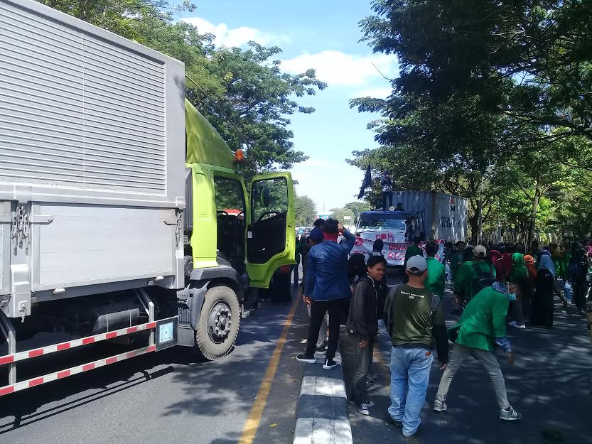 Blokade jalan dilakukan dengan memalang truk tronton di tengah badan jalan.