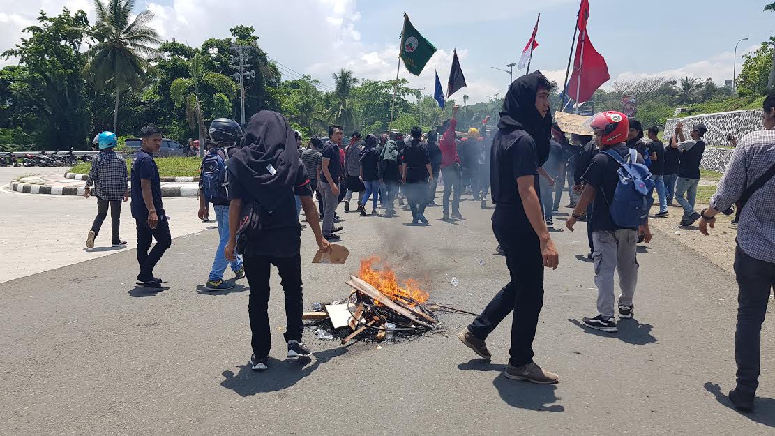 Mereka juga membawa sejumlah spanduk berisi tuntutan mereka dan dibentangkan di depan massa aksi.