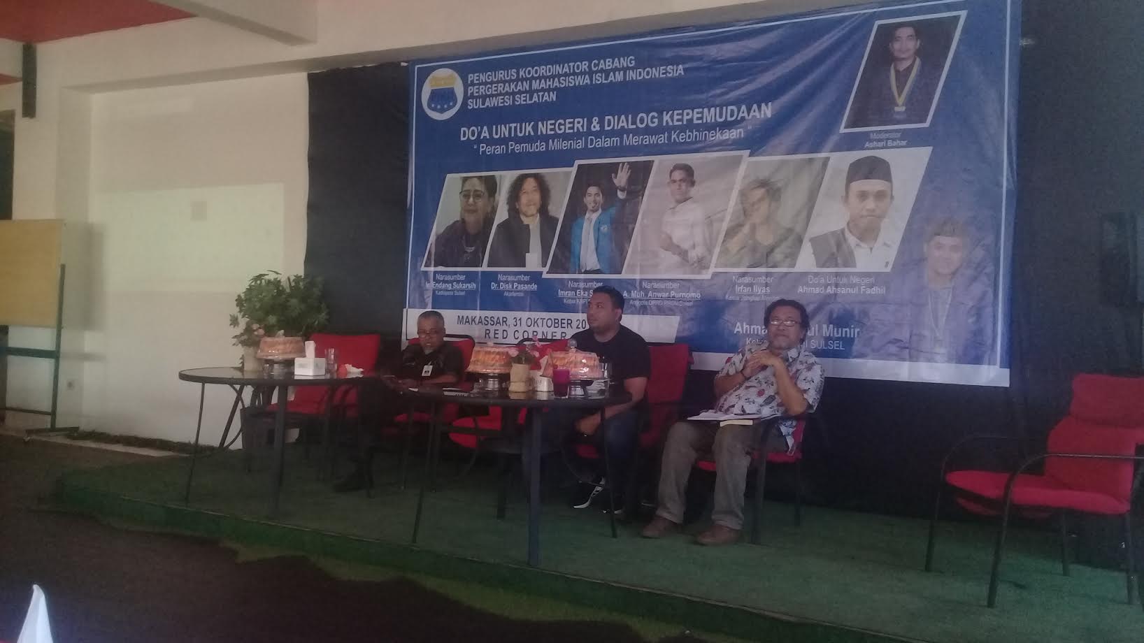 Melalui diskusi kepemudaan dalam rangka memperingati hari sumpah pemuda di Red Corner, Jl Yusuf Dg Ngawing, Makassar, Kamis (31/10/2019) siang, PMII Sulsel mengangkat tema peran pemuda menjaga kebhinekaan.