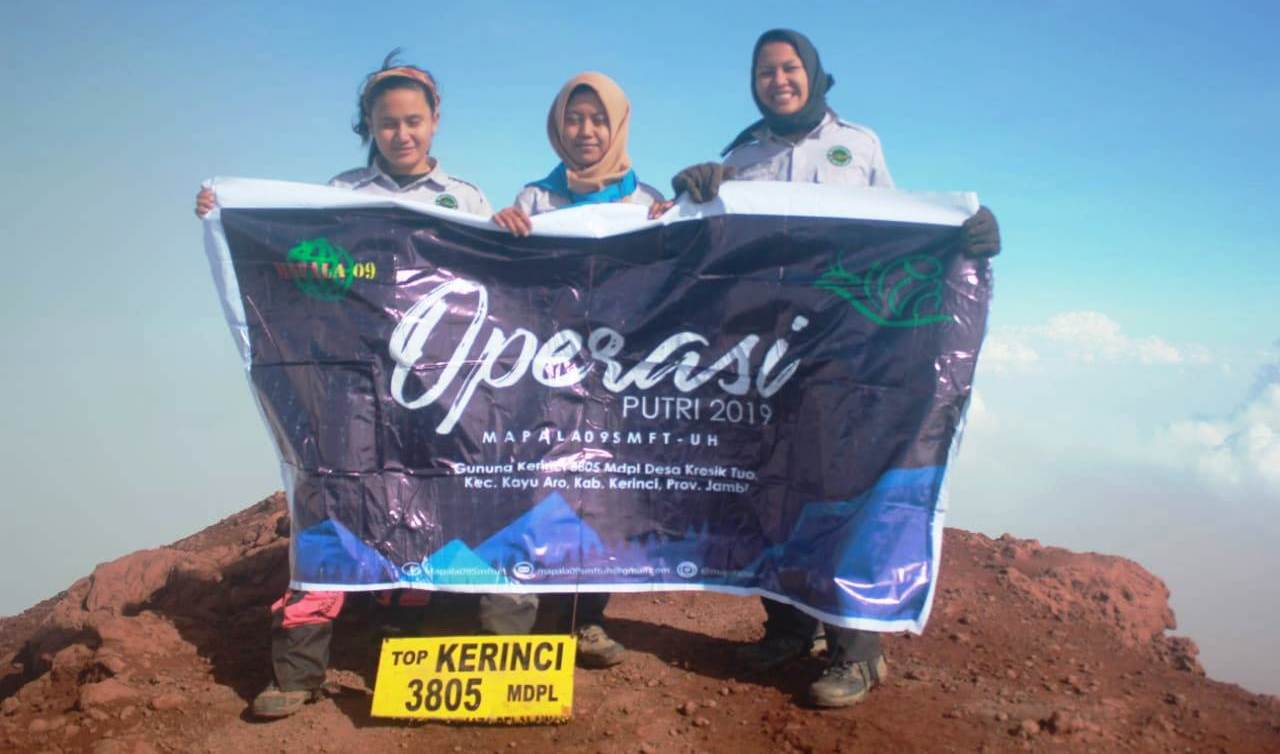 tiga anggota puteri Mapala 09 FT Unhas melakukan pendakian Gunung Kerinci di Desa Kersik Tuo, Provinsi Jambi, awal Oktober 2019 lalu.