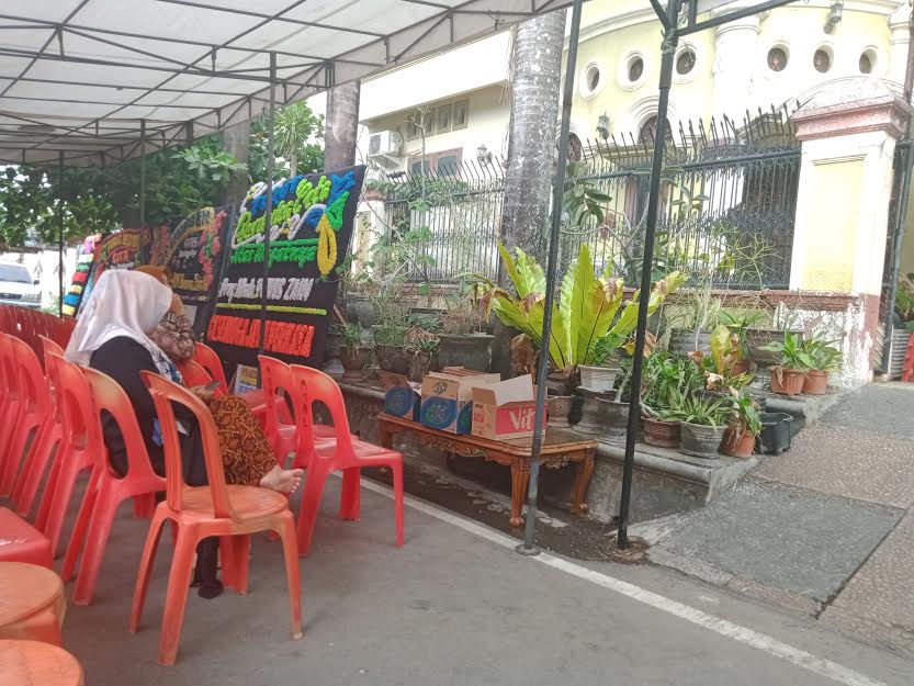 Sejumlah karangan bunga dari berbagai pihak tersusun rapih di depan rumah duka dan sampingnya.