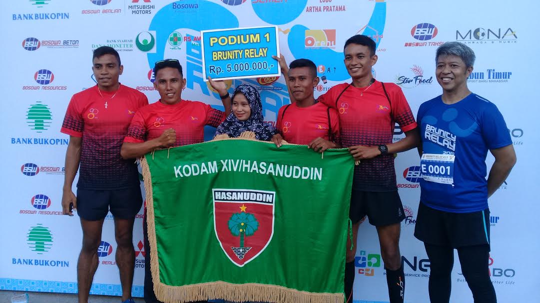 TRIBUN-TIMUR.COM, MAKASSAR- Tim Triatlon Hasanuddin I, keluar sebagai sebagai peraih podium pertama lomba lari estafet 25K Bosowa Runners Unity (BRunity), Minggu (10/11/2019).