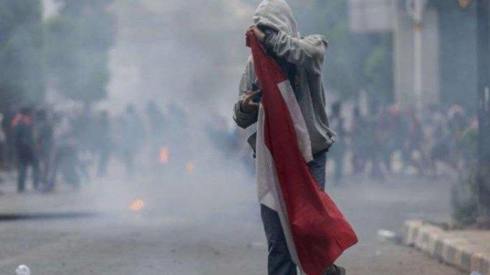 Foto tersebut memperlihatkan sosok pemuda yang membawa bendera merah putih saat Demo.