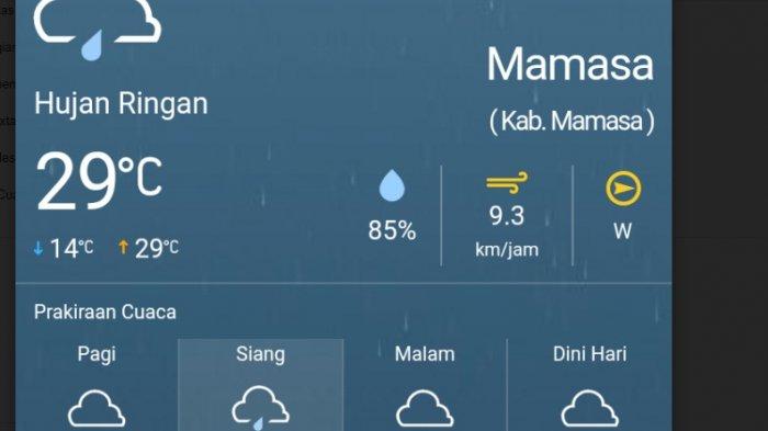 BMKG juga memprediksi, sebagian besar wilayah Kabupaten Mamasa siang hari ini hujan ringan dengan suhu udara 29° Celsius, kelembapan 85 persen.