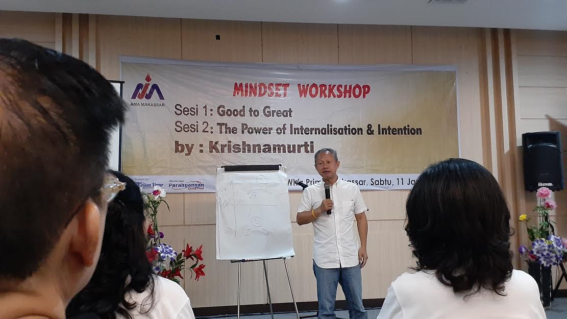 TRIBUN-TIMUR.COM, MAKASSAR - Ada yang menarik saat pembicara motivator ternama Krishnamurti memberikan materi tentang Good to Great kepada peserta seminar dan workshop.