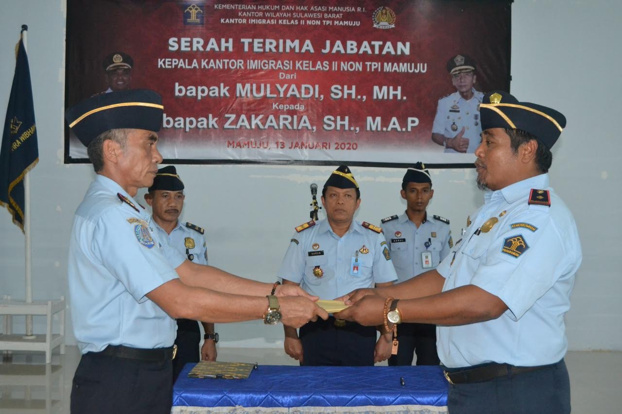 TRIBUN-TIMUR.COM, MAMUJU - Kakanwil Kemenkum HAM Sulbar, Harun Sulianto, pimpin Sertijab Kepala Kantor Imigrasi Mamuju dari pejabat lama, Mulyadi kepada Zakaria di Aula Kantor Imigrasi Mamuju, Senin (13/1/2020).
