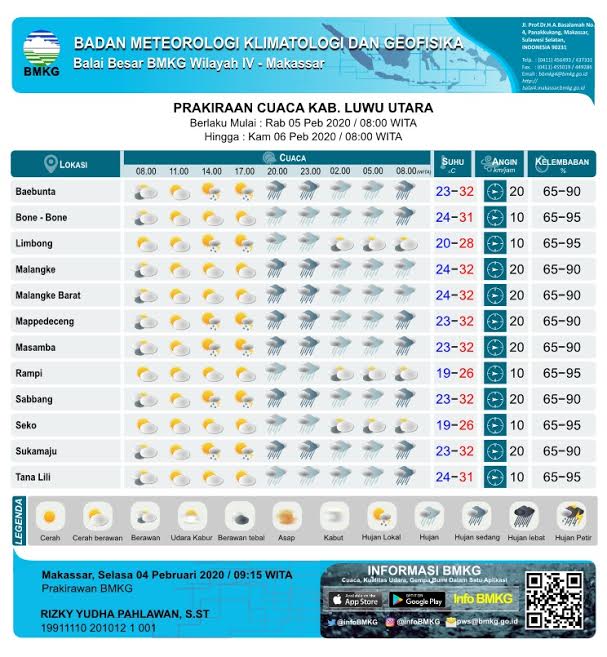 Rabu 5 Februari 2020, Berikut Prakiraan Cuaca di Luwu Utara Sepanjang Hari Ini