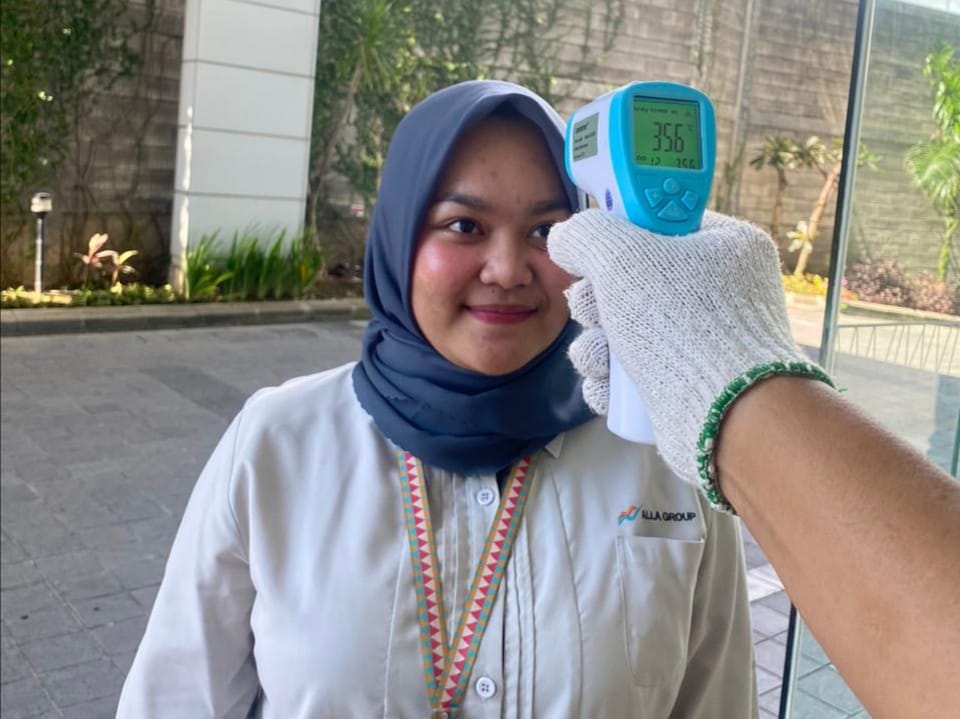 Seluruh karyawan Kalla Group yang harus masuk kantor sepanjang kebijakan ini berlaku juga diwajibkan untuk melewati deteksi Thermo Gun untuk mendeteksi gejala suhu tubuh.