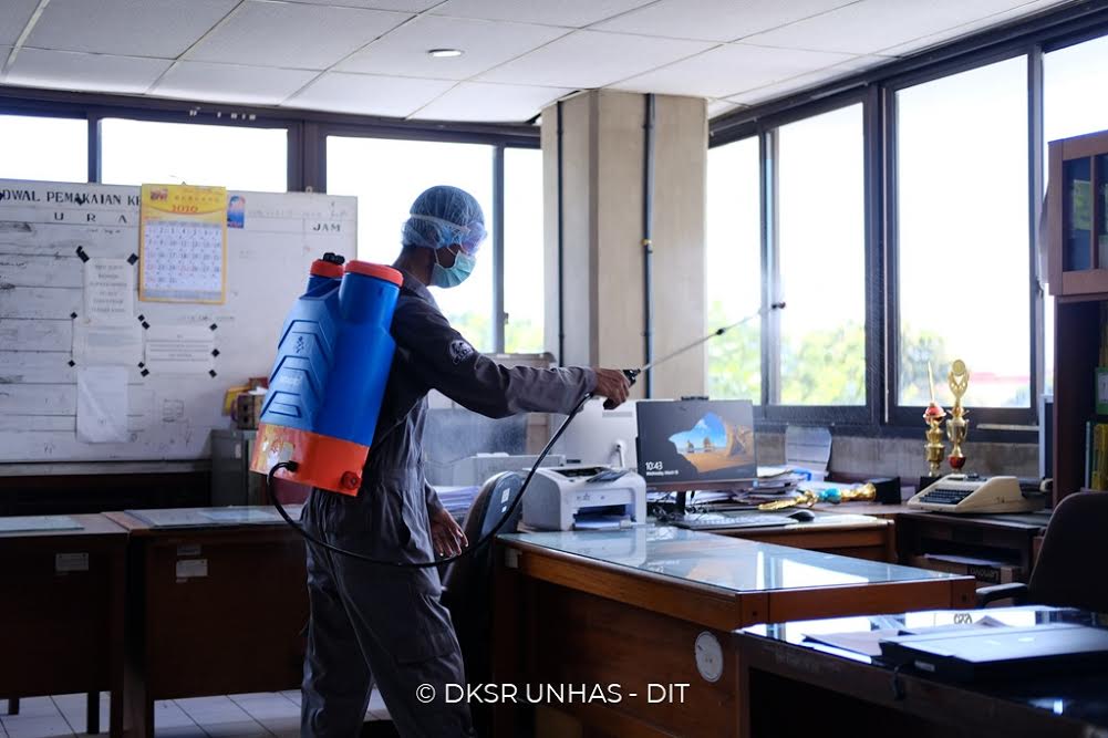 Khusus di lingkungan Rektorat Unhas, sebanyak tujuh mahasiswa yang terlibat melakukan penyemprotan hari ini. Para mahasiswa memasuki setiap ruangan pada setiap lantai yang ada di rektorat, terutama pada ruangan-ruangan dengan lalu lalang orang yang tinggi.