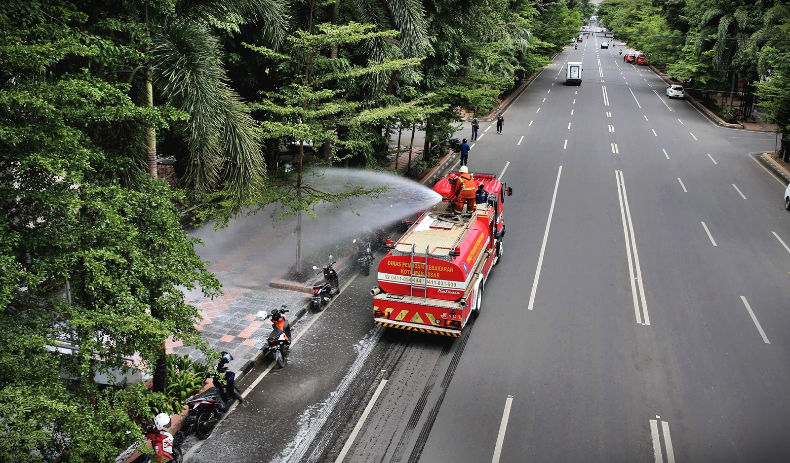 FOTO: Damkar Semprot Disinfektan Jalan Protokol di Makassar