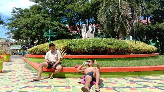 Di tengah wabah virus corona, Erly mengisi waktunya di pagi hari dengan berjemur. Uniknya dia memilih berjemur di lantai pertigaan Patung Sapi Enrekang.