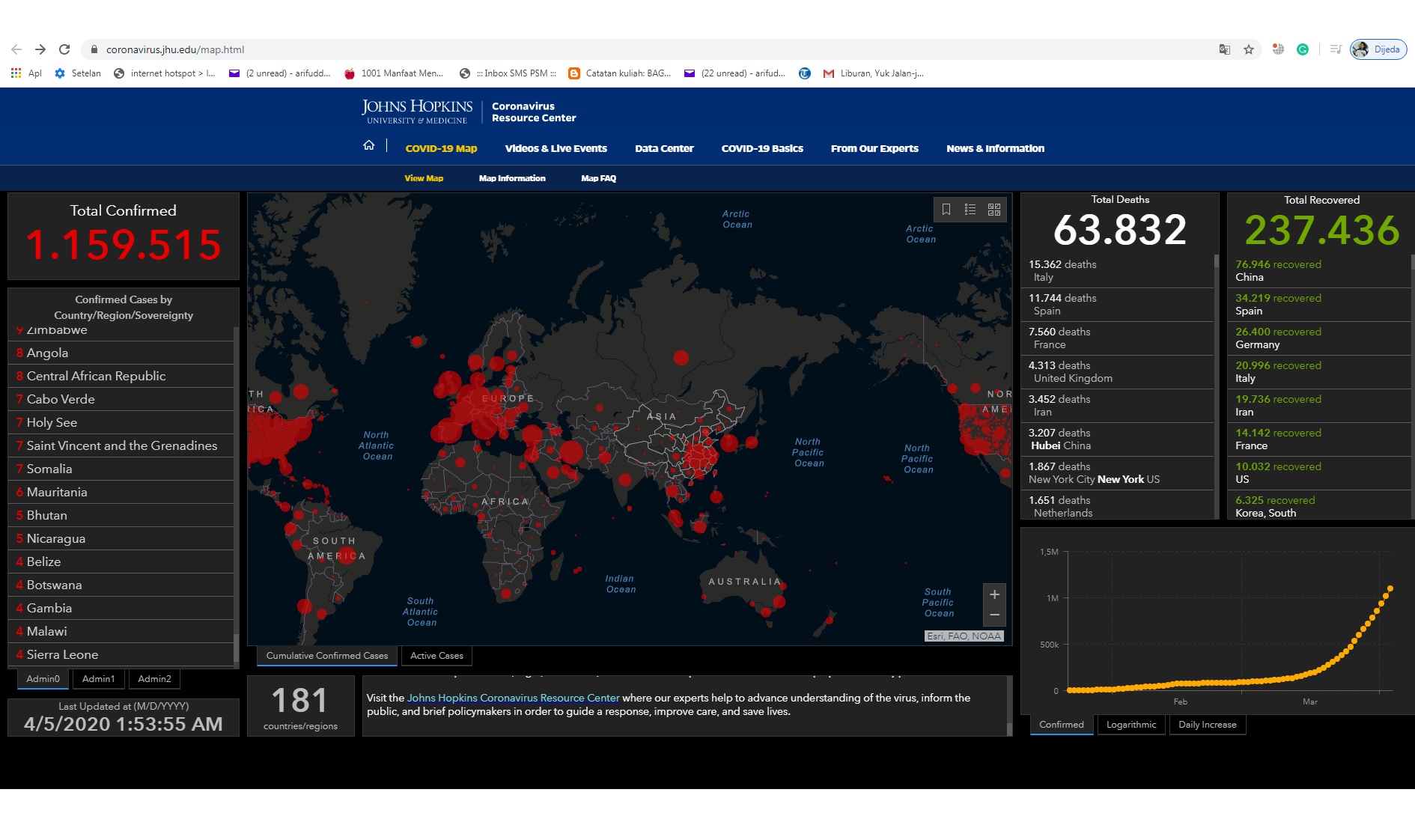 Data Center for Systems Science and Engineering (CSSE) Universitas John Hopkins, jumlah kasus positif virus corona tercatat sebanyak 1.170.159 kasus hingga Minggu (5/4/2020) dini hari.