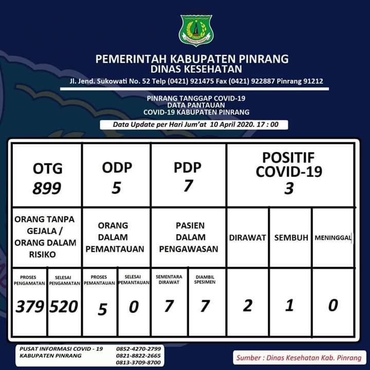 TRIBUNPINRANG.COM, WATANG SAWITTO - Dinas Kesehatan Kabupaten Pinrang, Sulawesi Selatan membeberkan data terkini Covid-19 di wilayah kerjanya, Jumat (10/4/2020) malam.