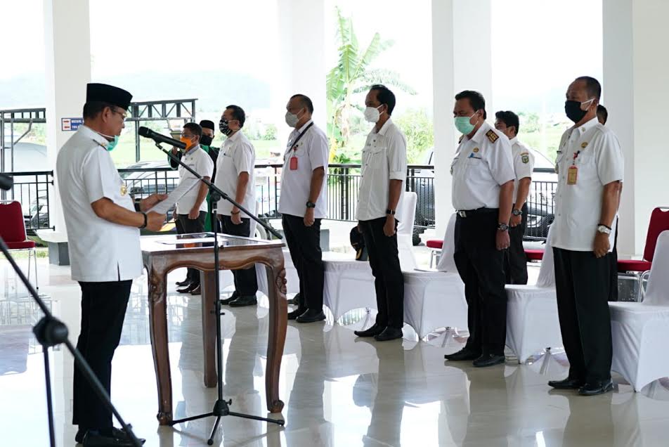Bupati Luwu, Basmin Mattayang, melantik dan mengambil sumpah pejabat baru di Aula Rumah Jabatan Bupati Luwu di Kelurahan Pammanu, Kecamatan Belopa Utara, Rabu (15/4/2020).
