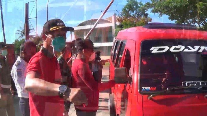 "Setiap mobil angkot dan tukang ojek yang lewat di terminal ini dihentikan dan diberikan masker, vitamin serta menempelkan stiker imbaun pencegahan covid-19 di mobil dan motor," ujar Emil Ilyas.