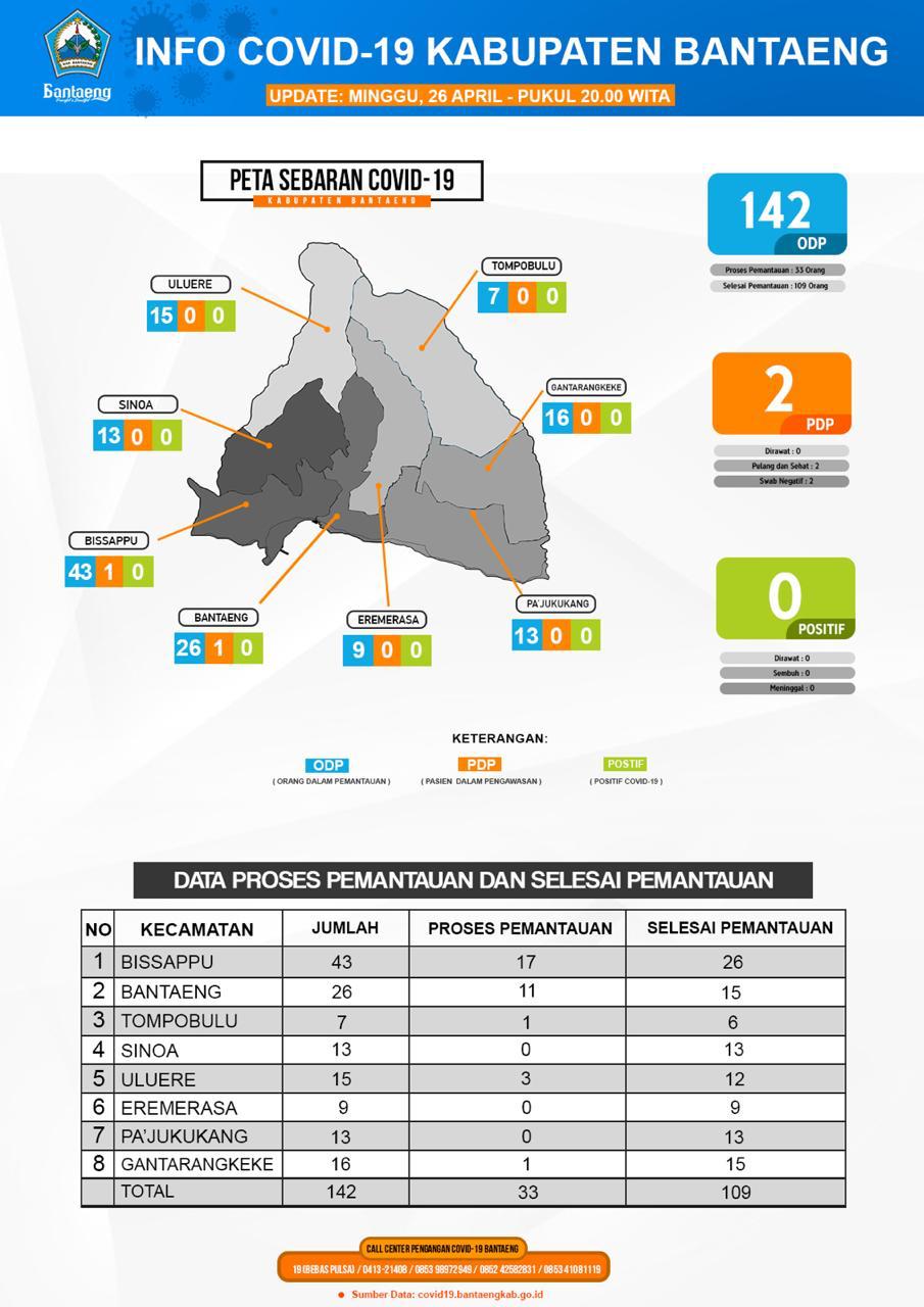 Untuk Pasien Dalam Pengawasan (PDP), 1 orang di Kecamatan Bissappu, 1 orang di Kecamatan Bantaeng, dan semuanya sudah dinyatakan negatif atau sembuh.