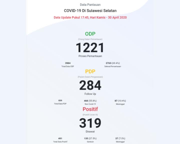 Berdasarkan dari data web https://covid19.sulselprov.go.id pada Kamis (30/4/2020) sekitar pukul 17.45 Wita memperlihatkan jumlah pasien positif Corona naik dari 465 pasien menjadi 491 pasien. Artinya bertambah 26 pasien