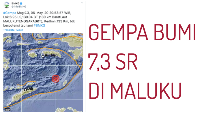 Gempa Bumi 7,3 SR mengguncang Maluku, Rabu (6/5/2020) malam. Informasi dari Badan Meteorologi, Klimatologi, dan Geofisika atau BMKG